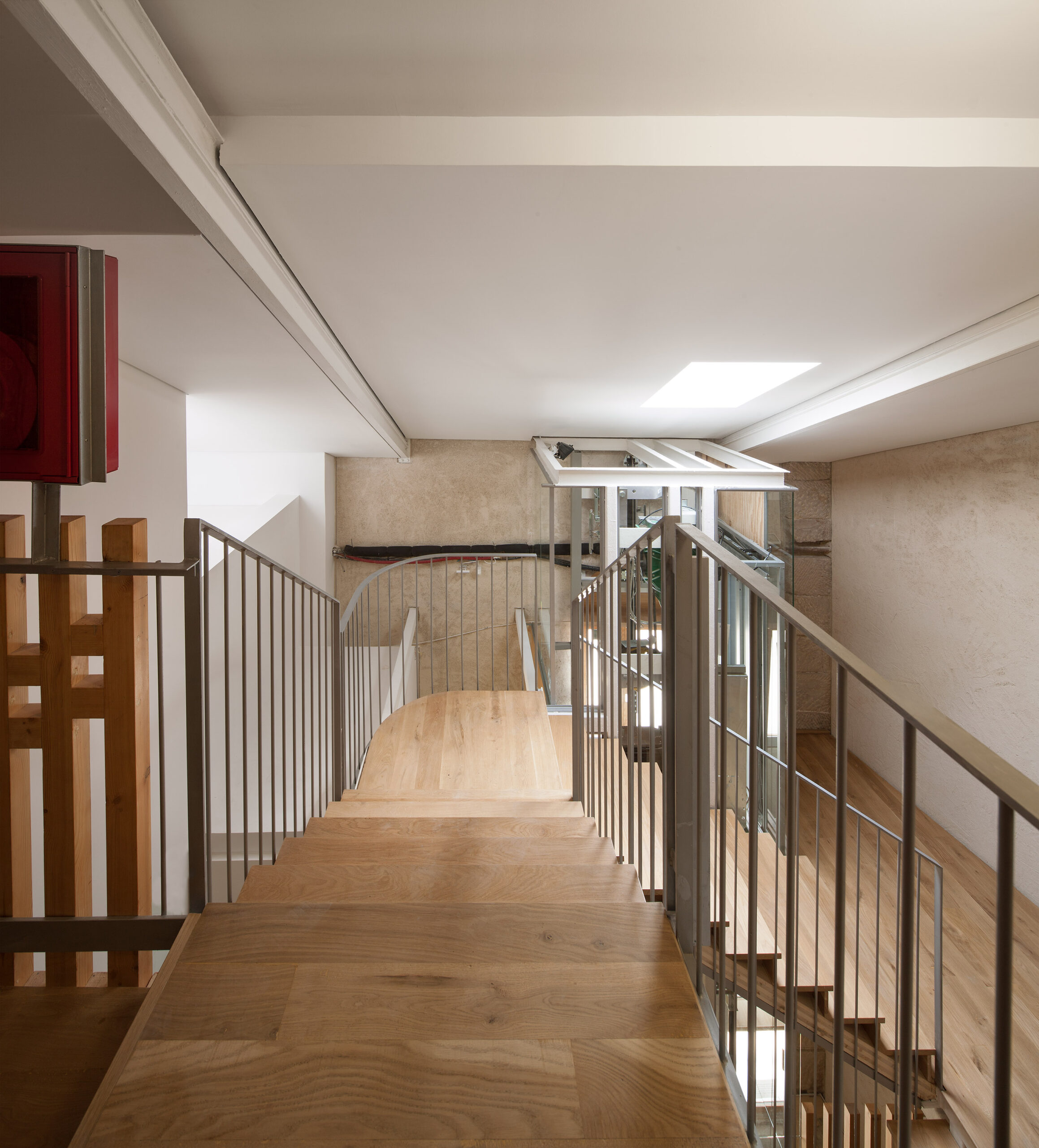 La instalación de un ascensor en el interior de la caja de escaleras obligó al derribo completo de las escaleras preexistentes de inicios del siglo XX para acceso a los usos parroquiales complementarios: vivienda, salas de reuniones y oficinas.