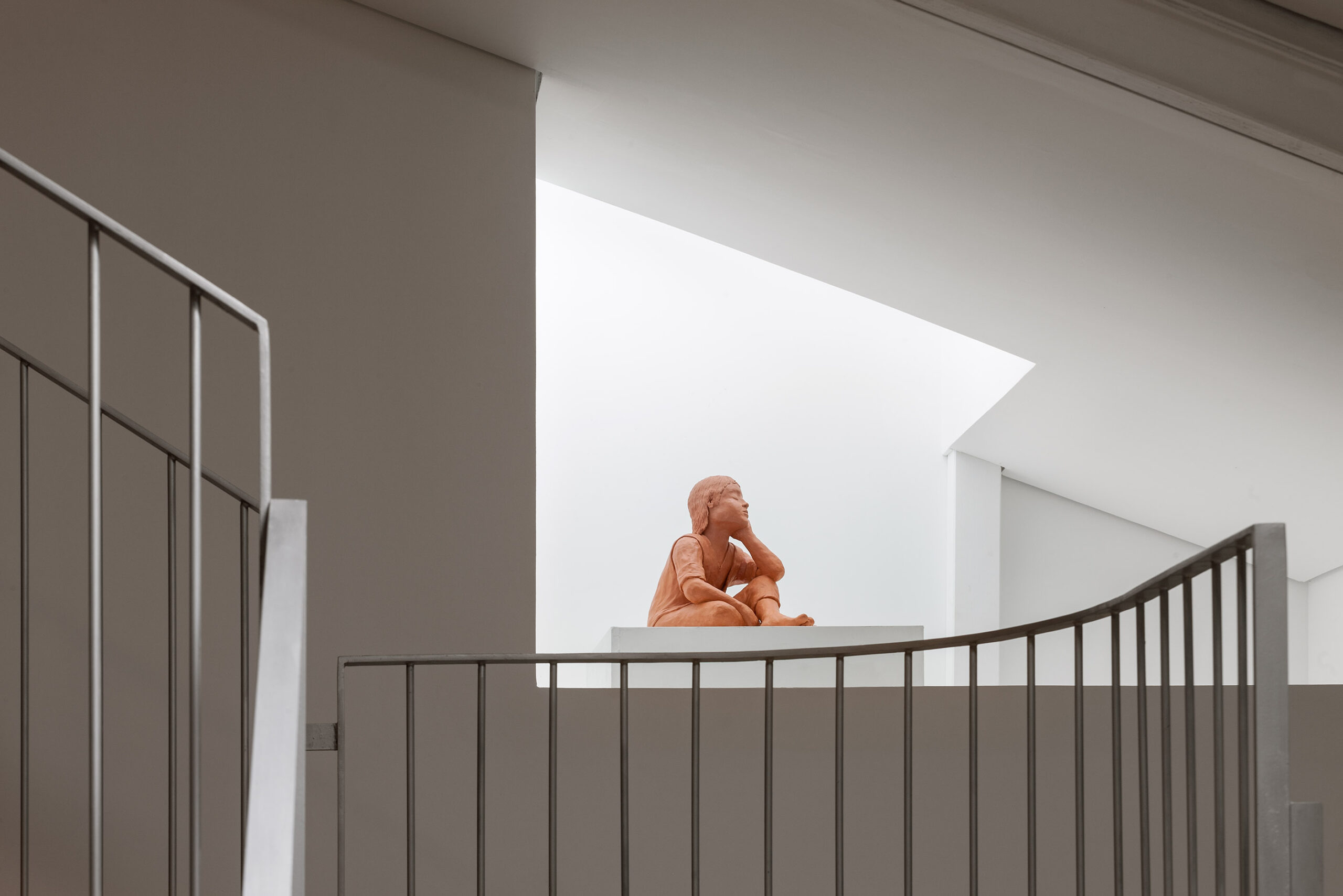 La obligación se convirtió inmediatamente en motivación y el resultado final espera reflejar la ilusión con la que se concluyeron estos trabajos. Al final del proceso encargamos a un amigo, Javier Laforet, y  posteriormente le compramos una sencilla pieza de barro cocido que esculpe una figura en contemplación. Decidimos situarla mirando hacia una potente entrada de  luz sur que incorporamos en el ultimo nivel bajo cubierta. Dejamos la pieza como donación a la parroquia en el año 2017.