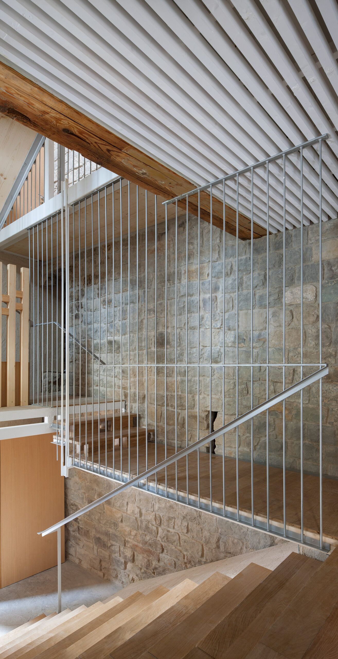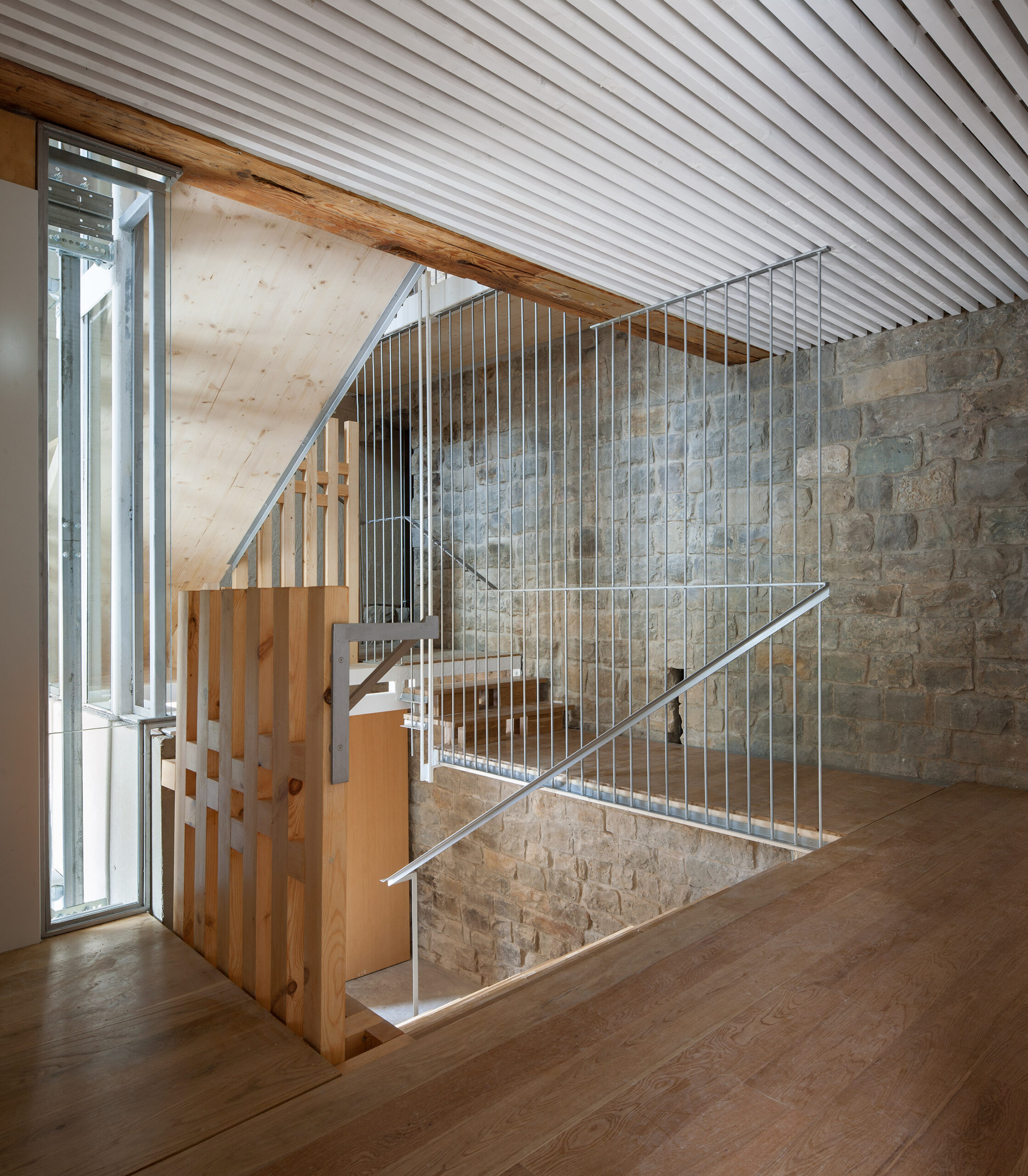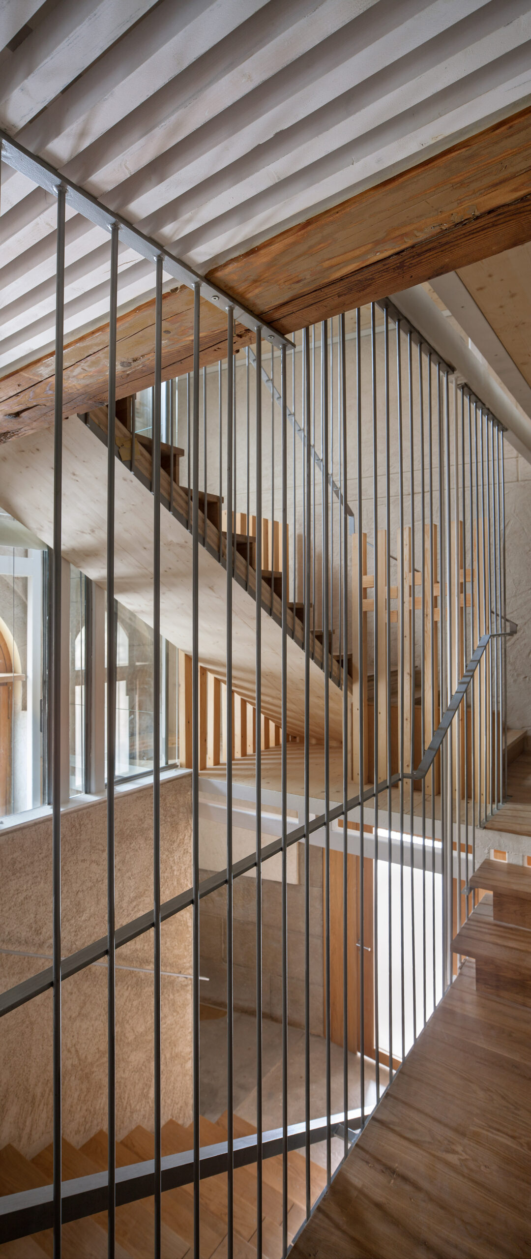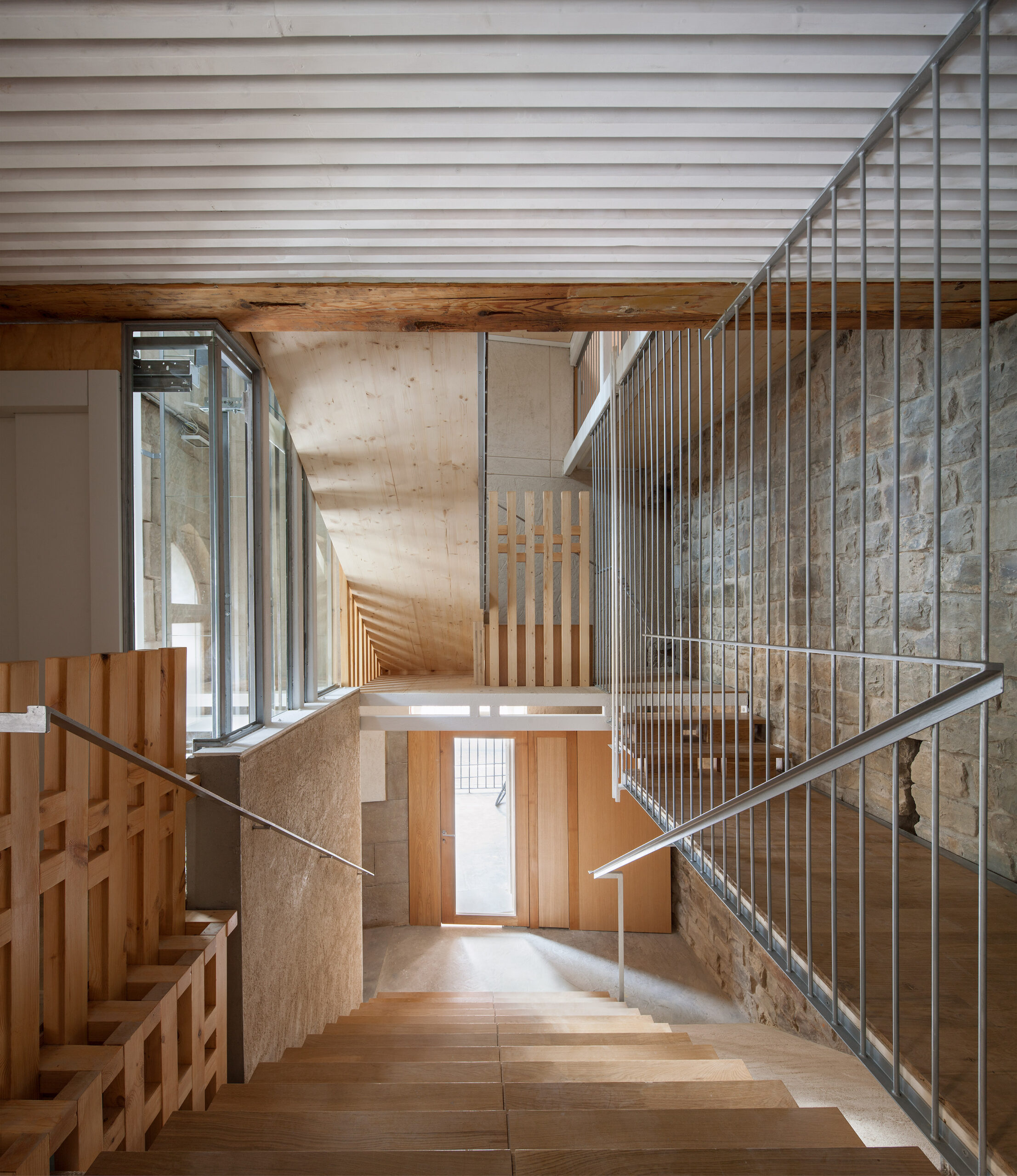 Para el desarrollo de las escaleras se incorporó CLT como base estructural de sus losas y se combinó con una estructura metálica. Resultó extremadamente trabajosa la resolución del trazado de tramos y descansillos por la absoluta falta de orden, simetría o proporción en las alturas y desembarcos.