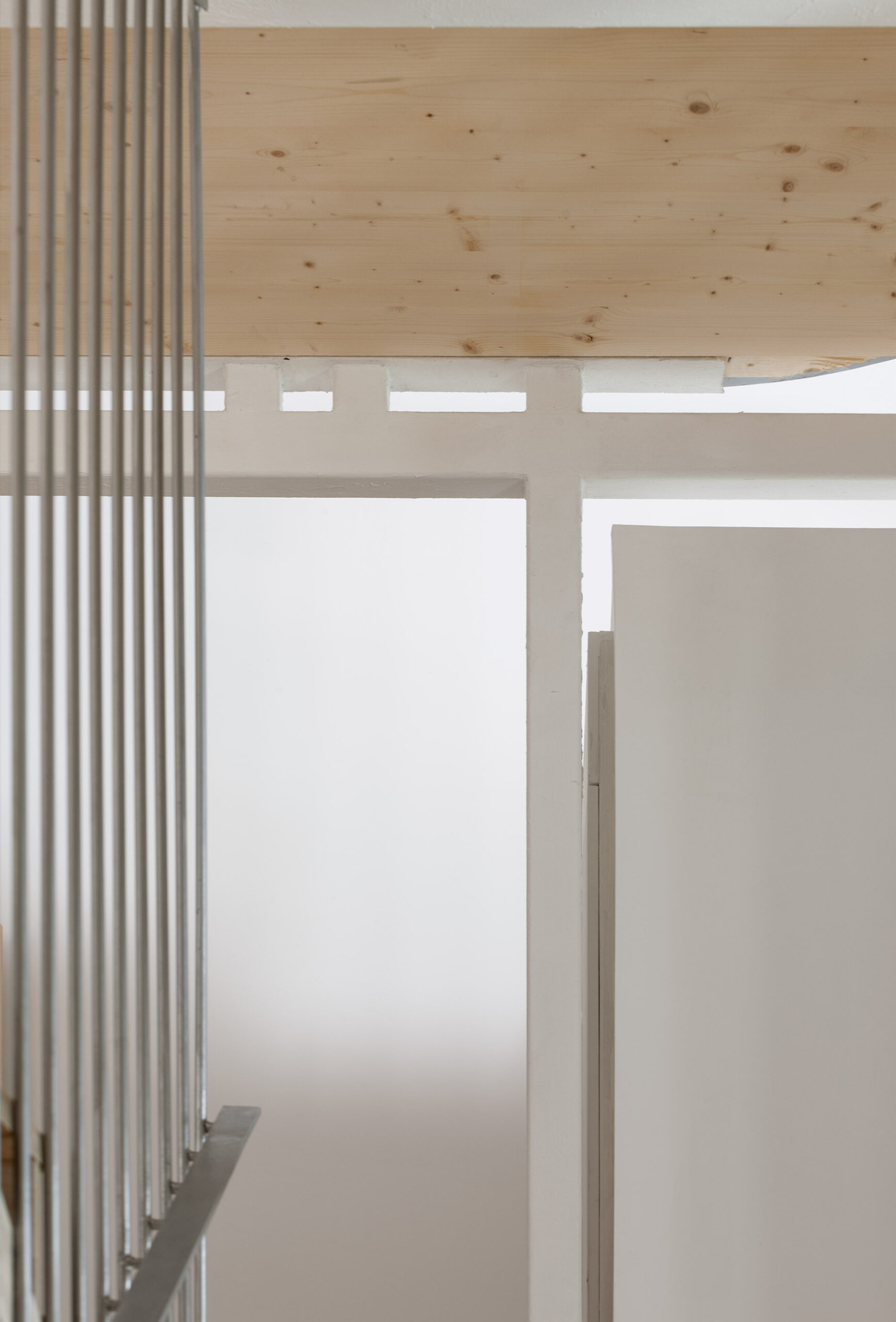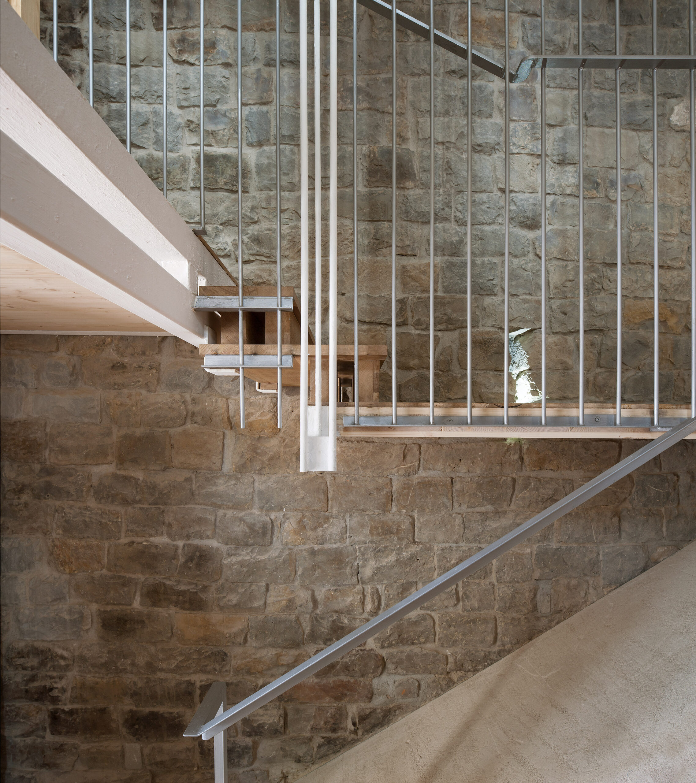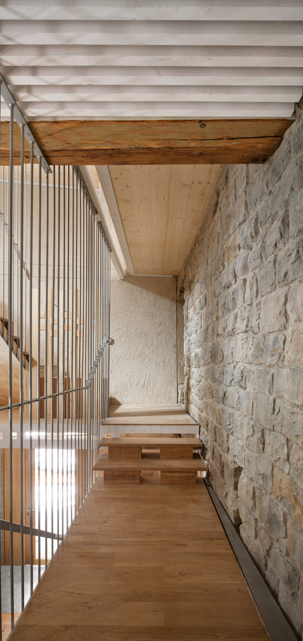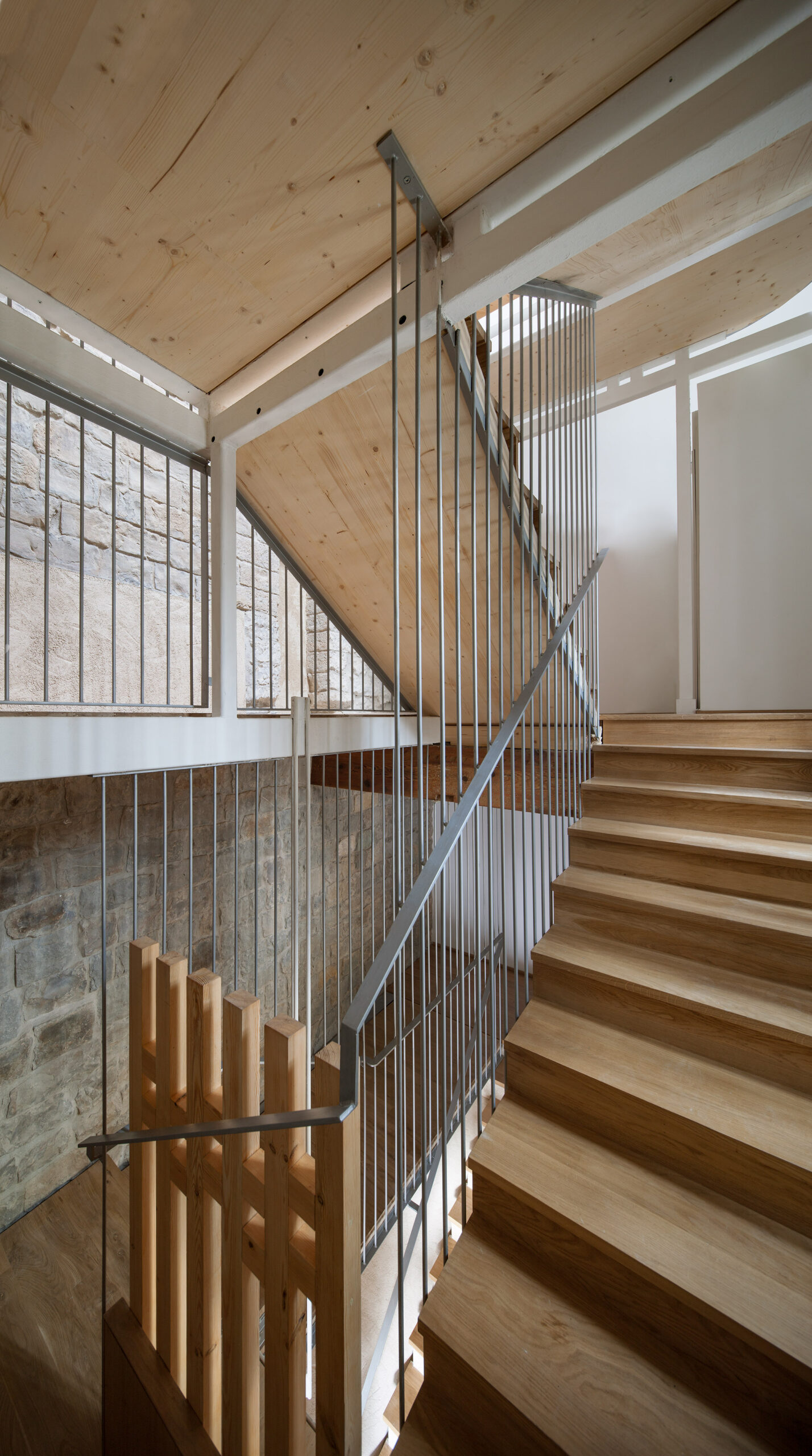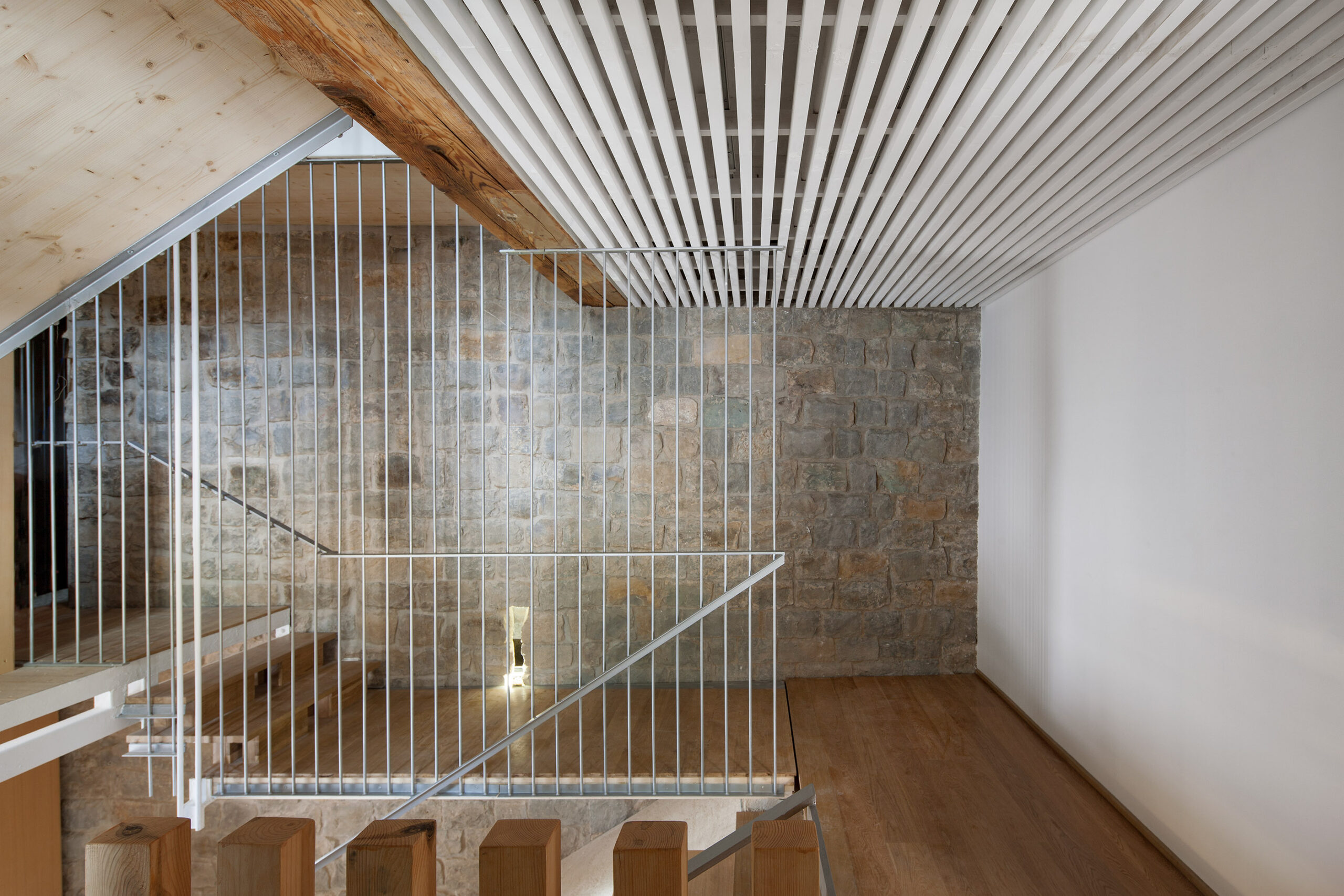 Para el desarrollo de las escaleras se incorporó CLT como base estructural de sus losas y se combinó con una estructura metálica. Resultó extremadamente trabajosa la resolución del trazado de tramos y descansillos por la absoluta falta de orden, simetría o proporción en las alturas y desembarcos.